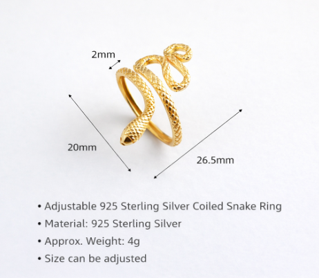 Crafted from genuine 925 sterling silver, the ring features a bold coiled snake design with elegant curves and a sculptural silhouette. The open adjustable structure creates a more flexible fit while giving the piece a modern and expressive look.