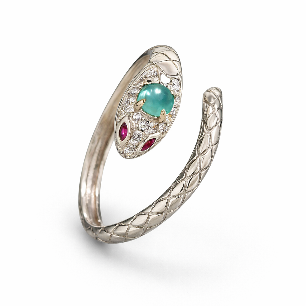 Available in blue-eye and green-eye variations, this piece offers a more distinctive alternative to classic snake rings while remaining elegant enough for everyday wear.